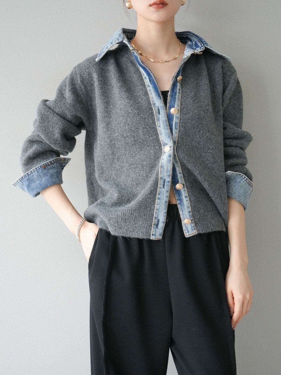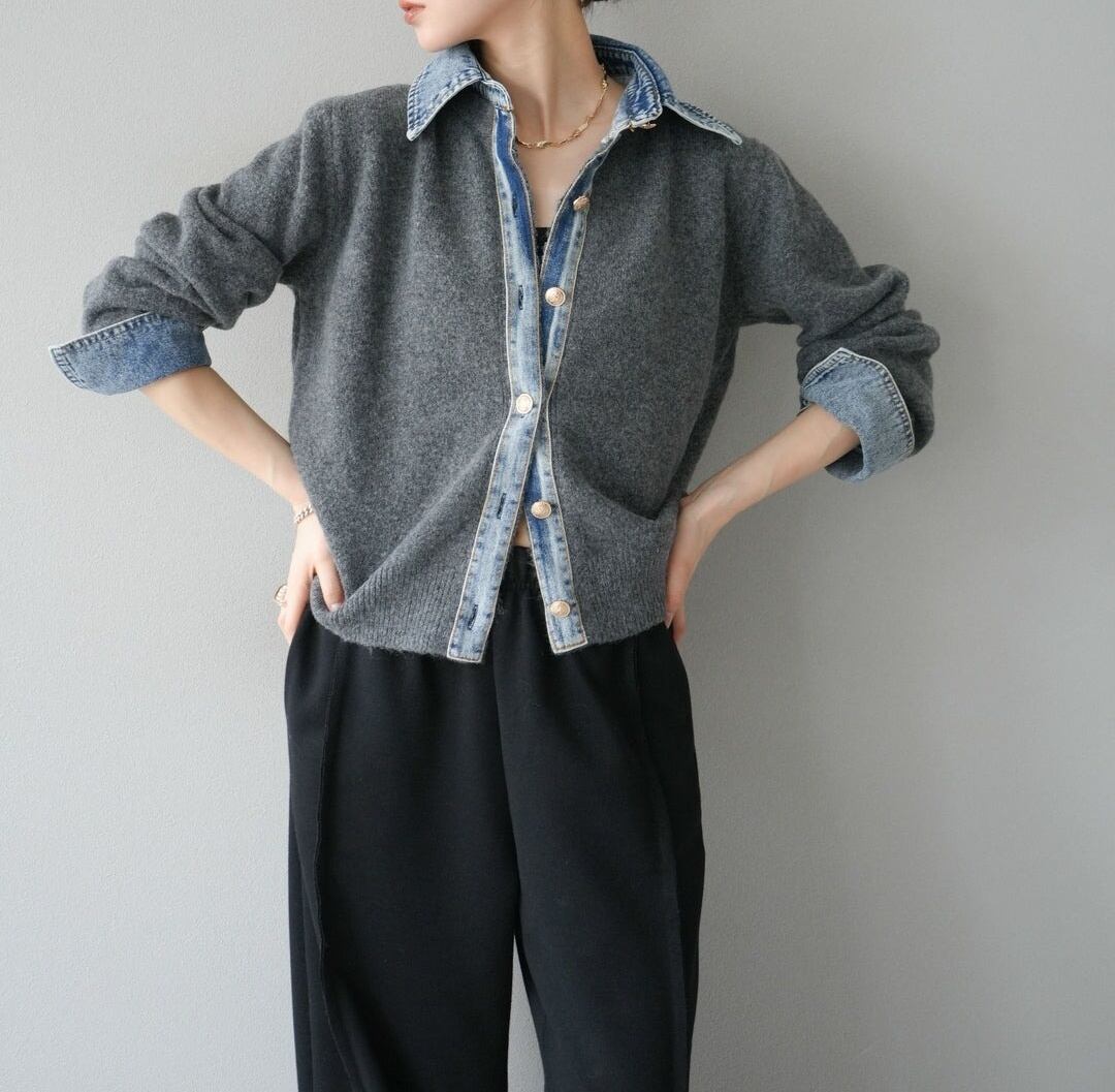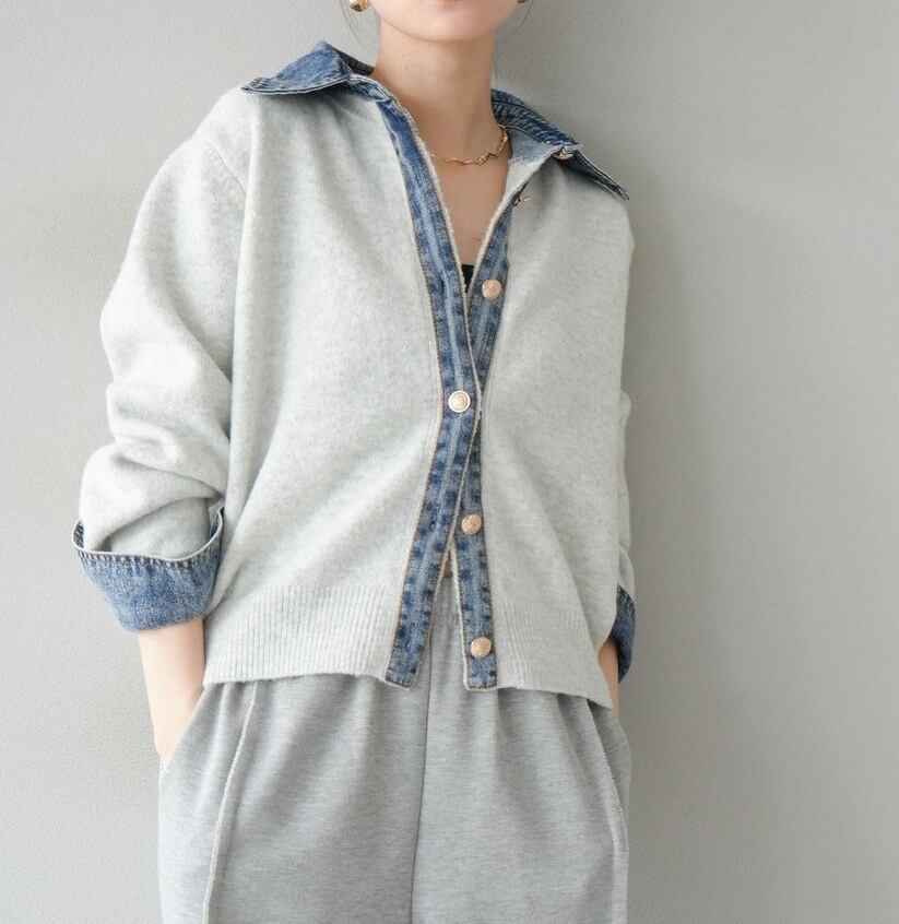 異素材ミックスならではの立体感があり、羽織るだけでコーデの主役に。ニットの柔らかさとデニムのカジュアルさが絶妙にマッチし、秋冬のレイヤードスタイルにも最適です。