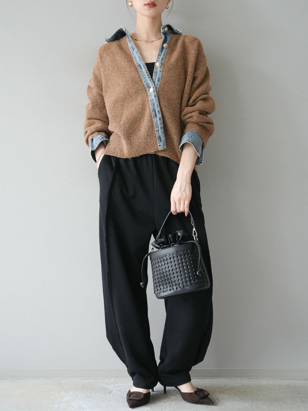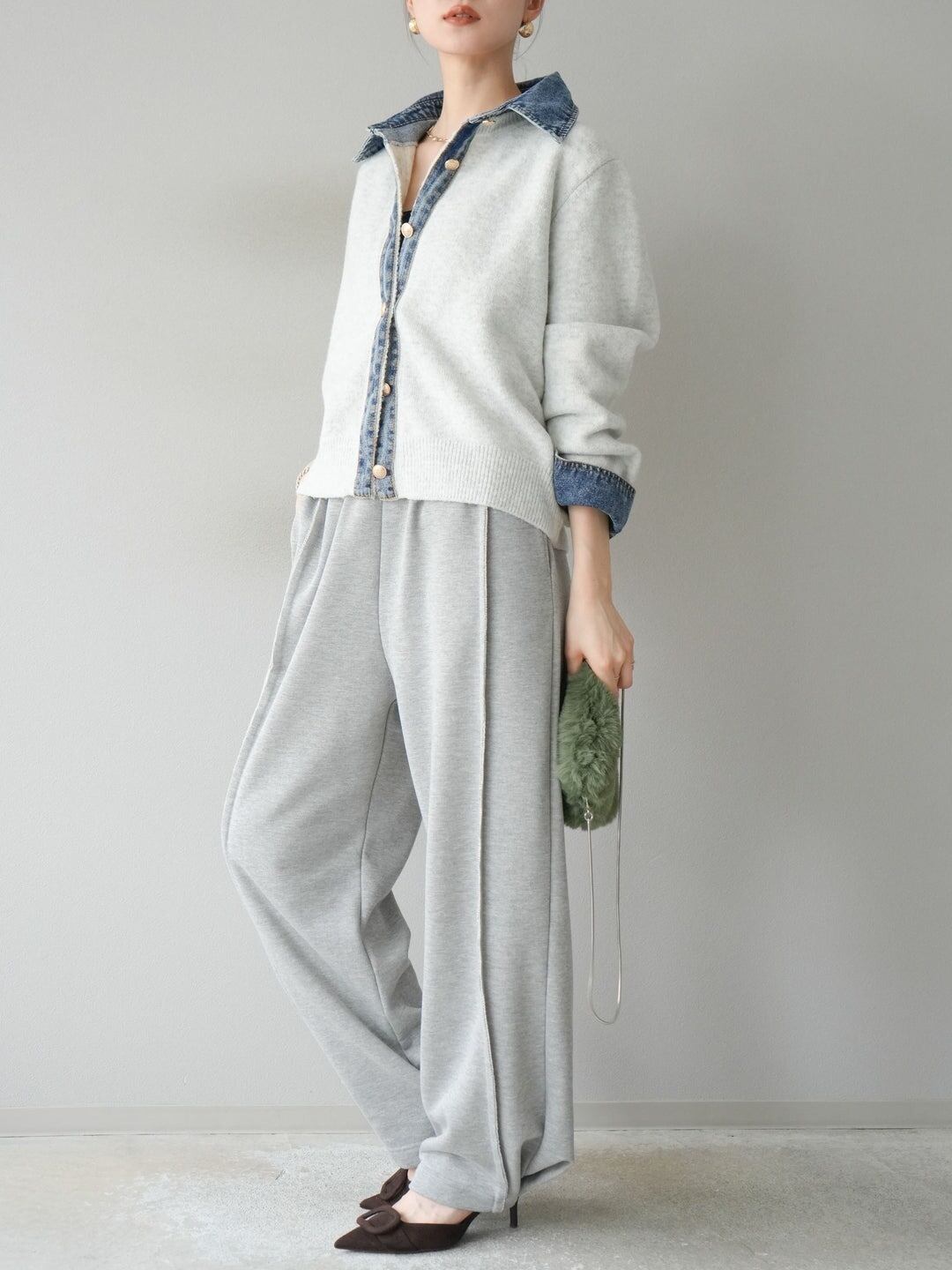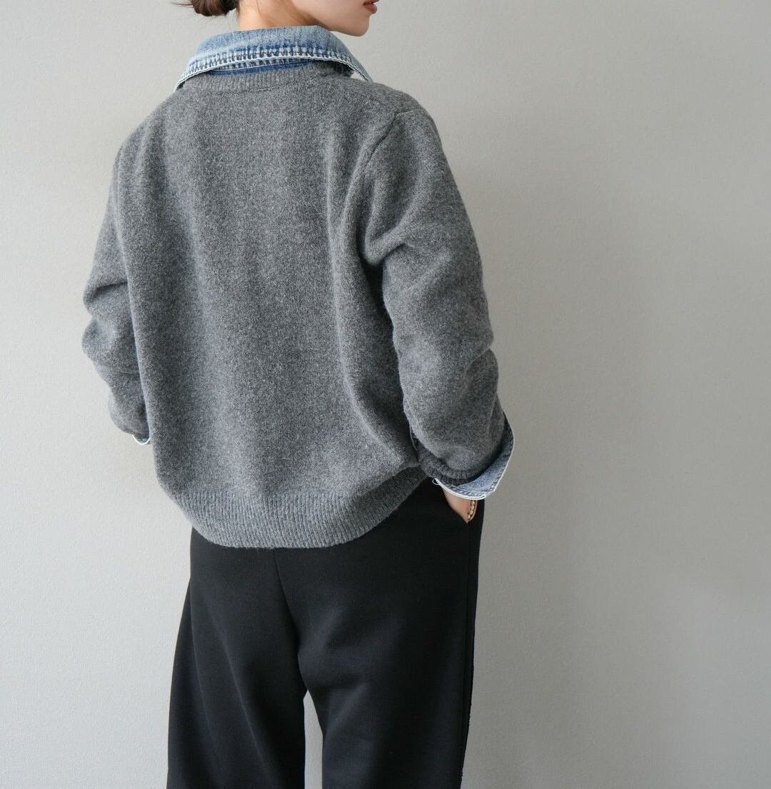 異素材ミックスならではの立体感があり、羽織るだけでコーデの主役に。ニットの柔らかさとデニムのカジュアルさが絶妙にマッチし、秋冬のレイヤードスタイルにも最適です。