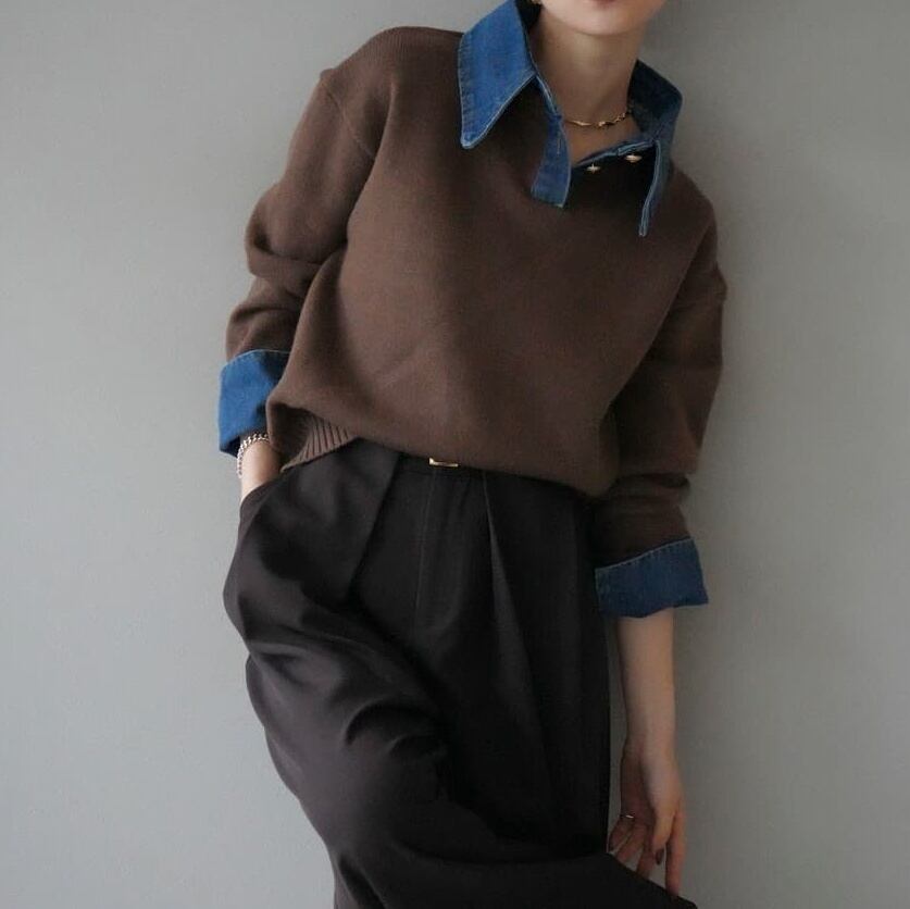 秋冬新作 気質 おしゃれ レイヤードツーピース風 デニム ルーズニットセーター