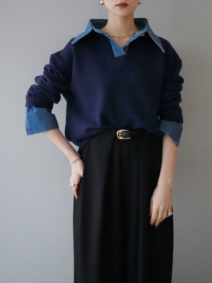 レイヤードツーピース風 デニム切替 ルーズニットセーター。