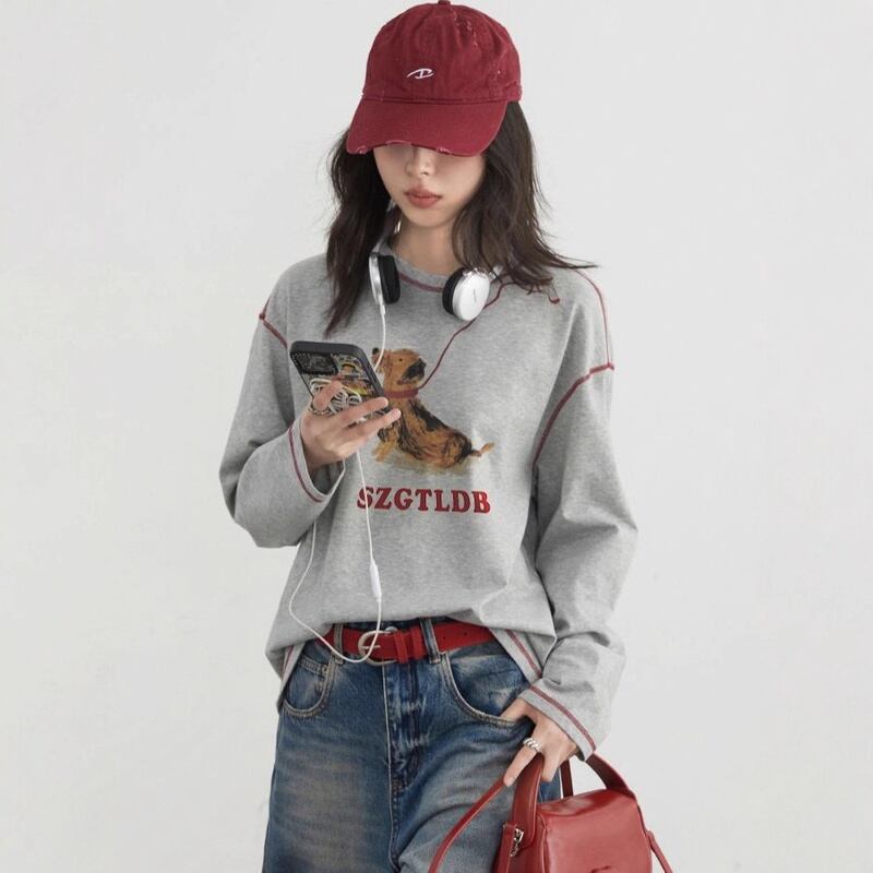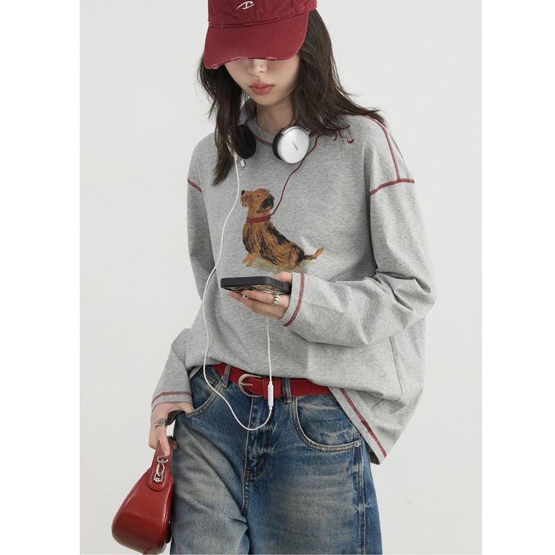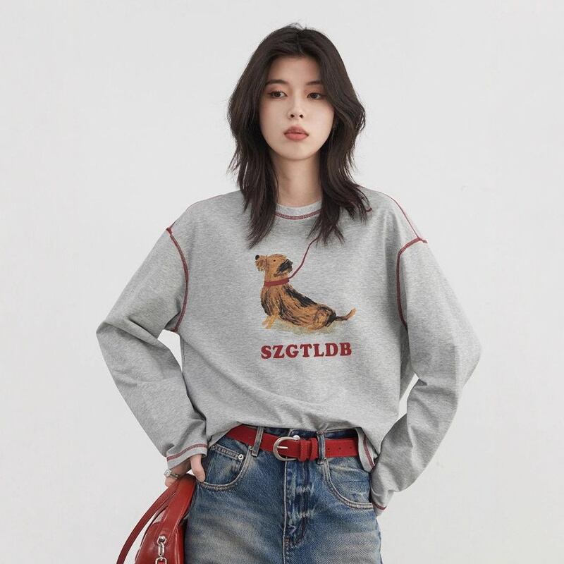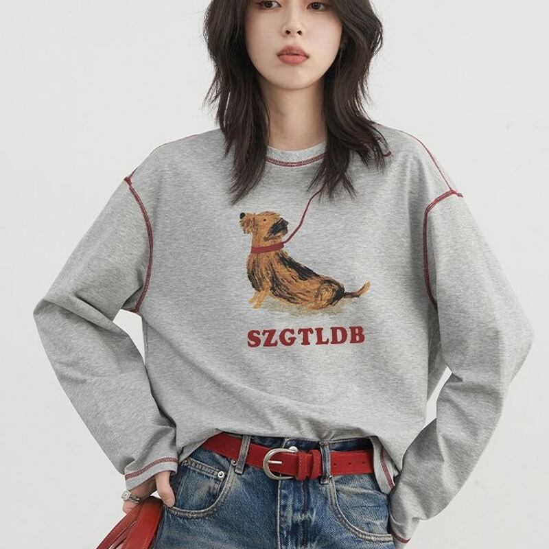 ゆるっとしたシルエットと遊び心あふれる犬柄プリントデザインが特徴のレディース長袖Tシャツ。