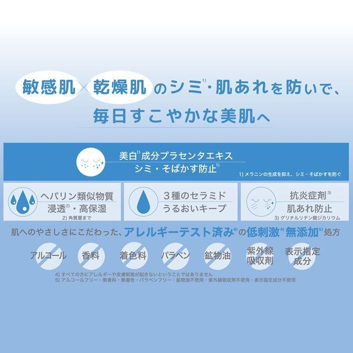 ・*1)メラニンの生成を抑え、シミ・そばかすを防ぐ *2)プラセンタエキス-1 *3) N-ステアロイルジヒドロスフィンゴシン、N-ステアロイルフィトスフィンゴシン、ヒドロキシステアリルフィトスフィンゴシン *4)アルコール・香料・着色料・パラベン・鉱物油・紫外線吸収剤・表示指定成分すべて無添加 *5)全ての方にアレルギーや皮膚刺激が発生しないということではありません。